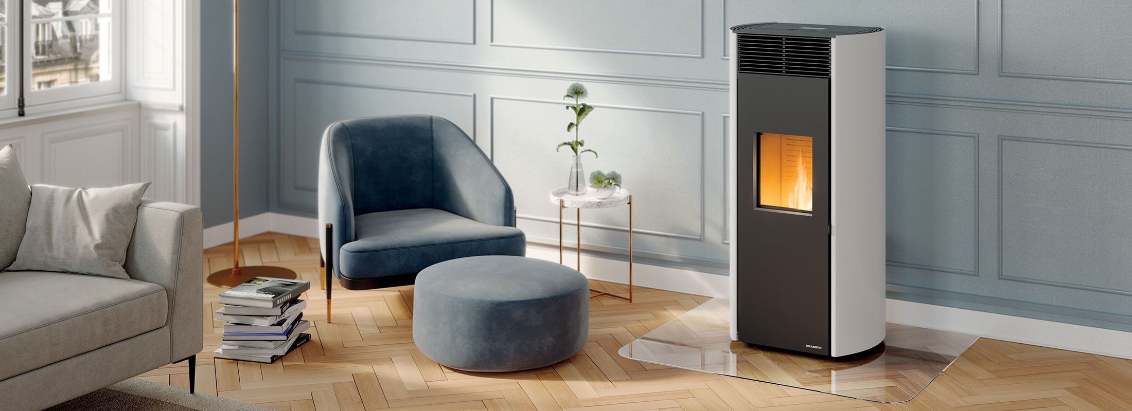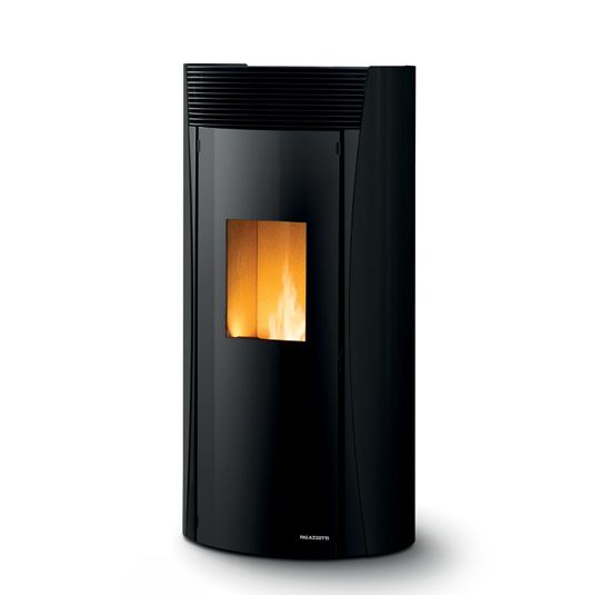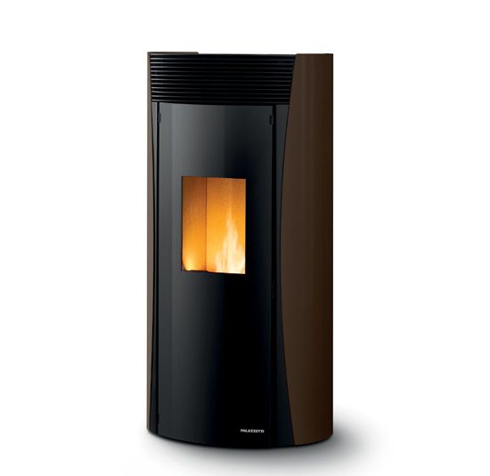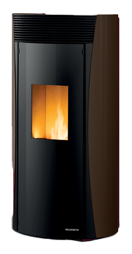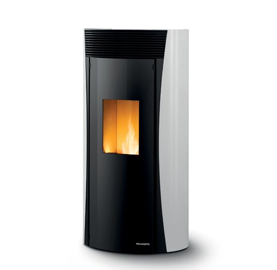 Stylish airtight pellet stove with a round design. It is equipped with the exclusive self-cleaning burning pot and the complete combustion system. Round glass door and painted steel cladding.